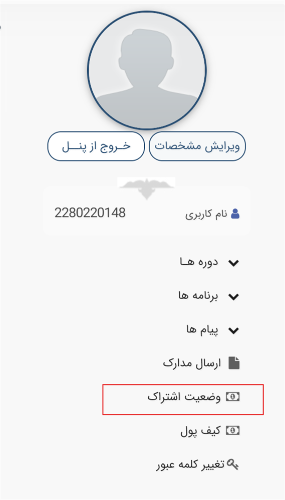 ۳. در منوی پنل، گزینه «وضعیت اشتراک» را انتخاب کنید.